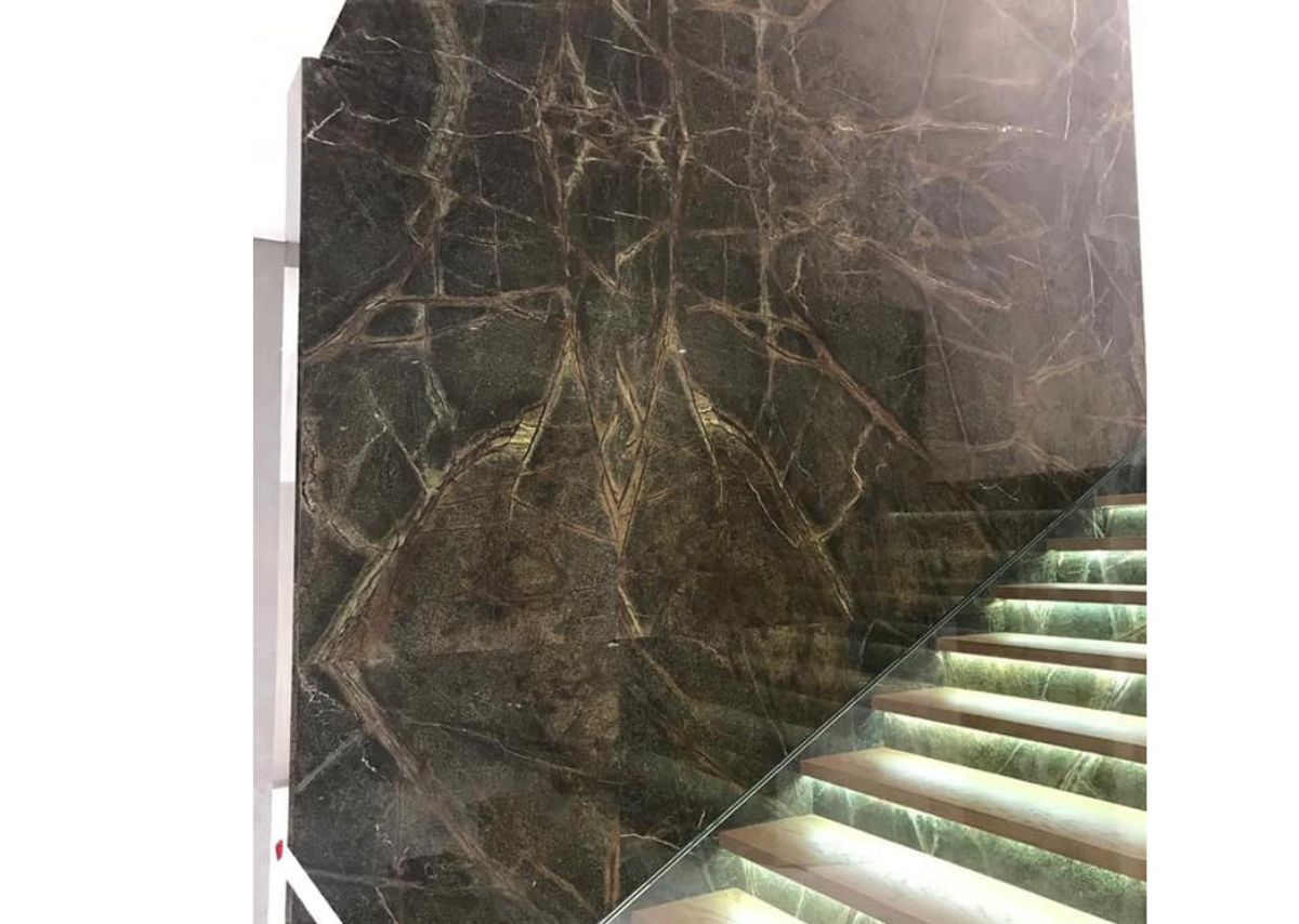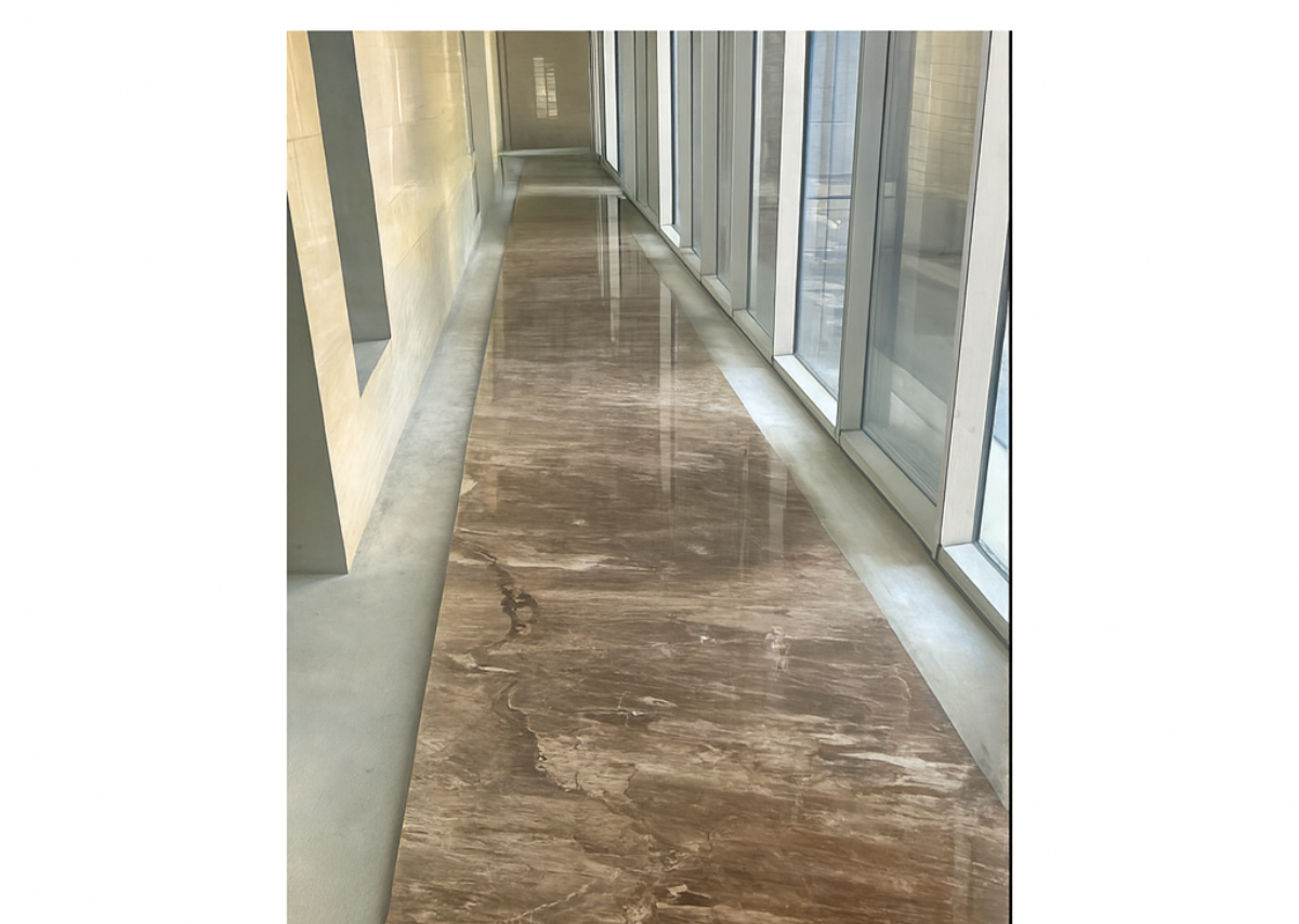 This project showcases the installation of premium polished marble flooring. The marble features a rich brown base with elegant white and beige veining, reflecting natural light.